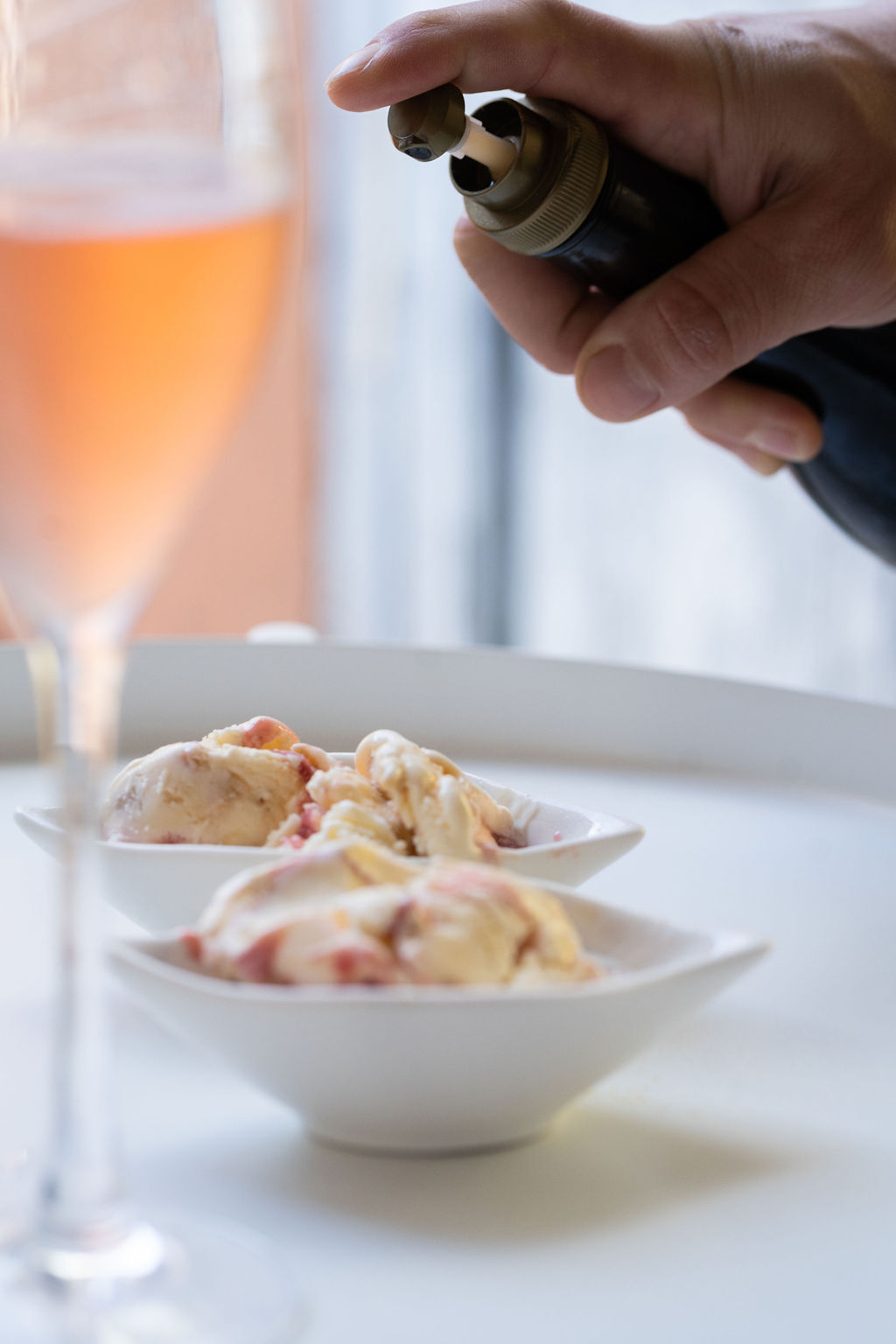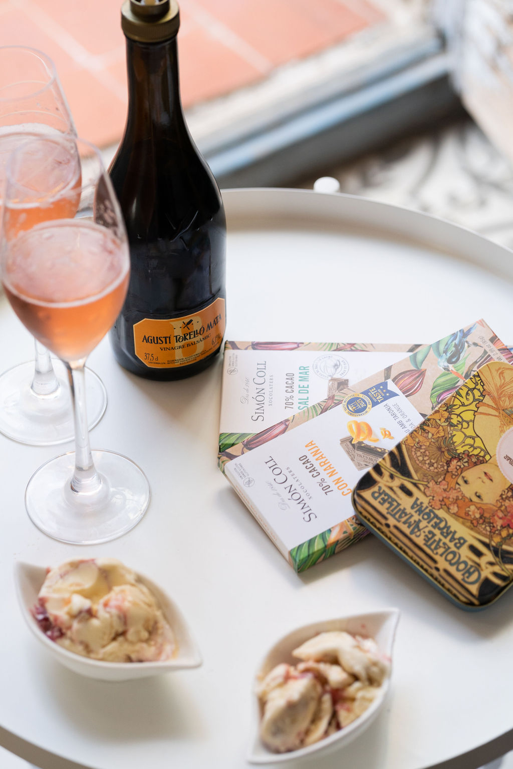 - Dessert: Simon Coll chocolate selection (from the local manufacture), fruit and yogurt ice cream with Agusti Torello Mata wine vinegar and rosé sparkling
