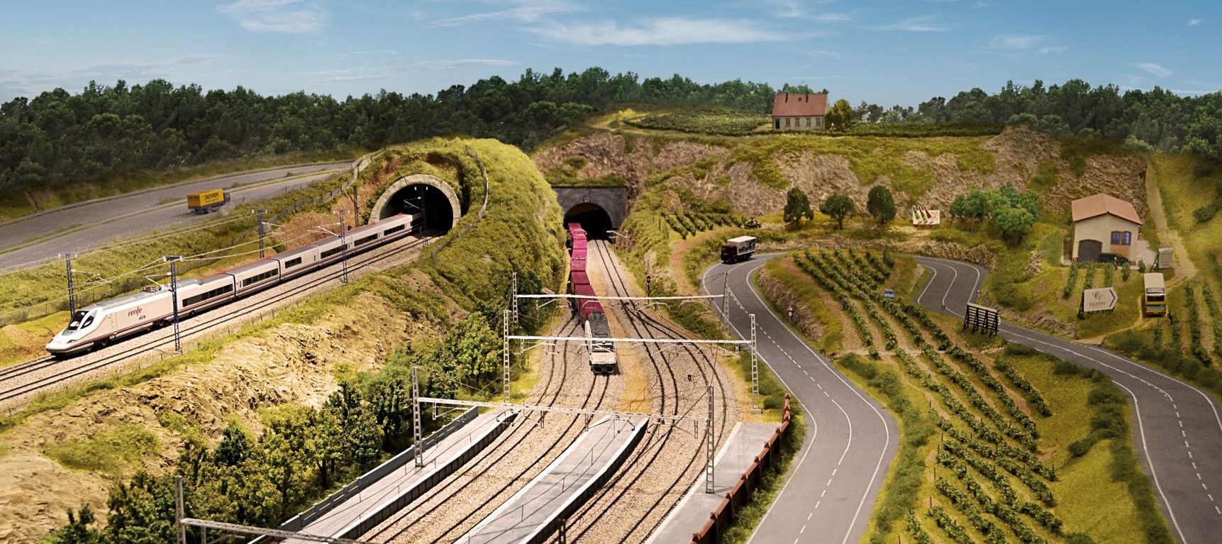 Celler Vell estate building on the far right, AVE Intercity train on the left