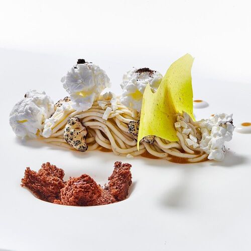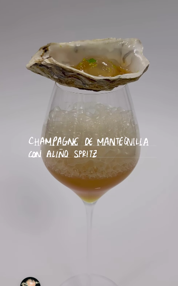 Another liquid madness is butter champagne, made from the lees of a 2000 vintage champagne, flavoured with browned butter, vanilla, and spices, and even a little vinegar spritz. Its texture deceives the eye and the mouth, evoking the brioche aromas of aged champagnes. And lest the concept become too rounded, oysters marinated in non-alcoholic manzanilla and ponzu shake the unsuspecting consumer out of their champagne dreams.